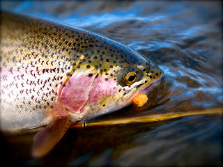 | This rainbow hen thought she was knocking off the competition. If you fish spawning periods take extra care in your step and with handling the trout. |